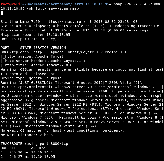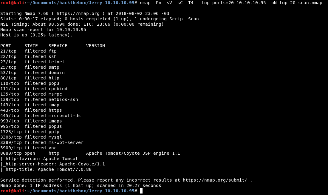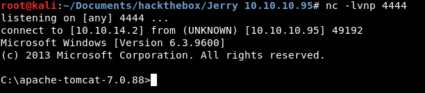 Jerry was a fun box, and ideal for beginners. It involves a simple but effective attack that can be found in real assessments like a service running with default credentials and as Administrator. The use of msfvenom is also a good introduction to the tool.