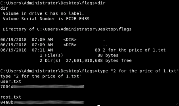 I can now execute commands on the remote machine. And in this case, the service is running as Administrator, so I can simply navigate to the Administrator's Desktop folder and find my two flags: