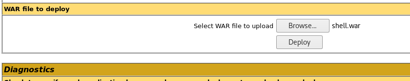 This file needs to be uploaded from the dashboard, so that's the next step. I go to the Tomcat Manager, find the section WAR file to deploy and upload it.