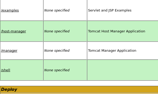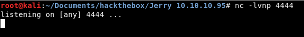 If I click on /shell link, it'll redirect me to the page where it deployed my .war file. Once it does this, it will execute a reverse shell to port 4444 and will try to connect to my machine. I set up an nc listener for this, on port 4444.
