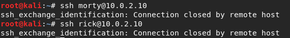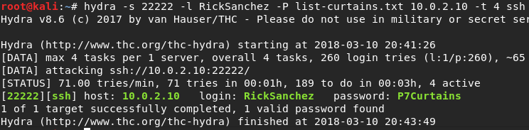 After that, I ran hydra to brute-force ssh login on port 22222 using the username 'RickSanchez'. I tried with the two lists, and after a while I got this results, with the list-curtains.txt file: