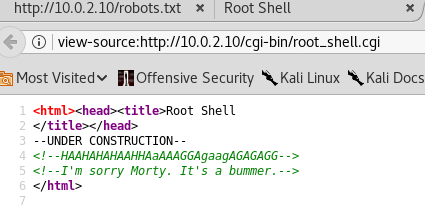 Whoa, Rick is everywhere! there is a /cgi-bin/root_shell.cgi resource. If we check it it says UNDER CONSTRUCTION, but if we check the source... There it is Rick again!