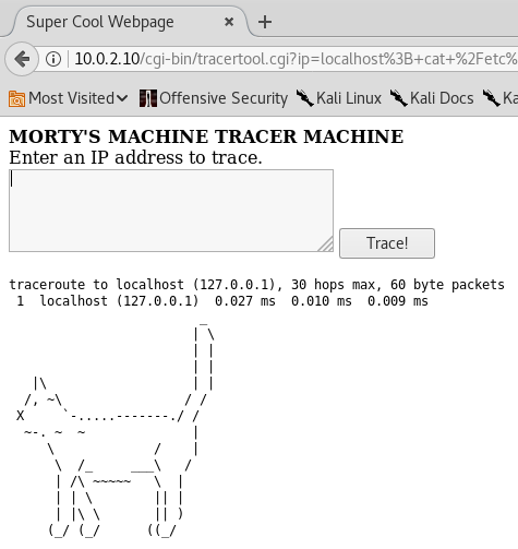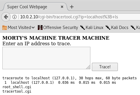 Ok, it seems to run traceroute (duh!) and show the result of the command below the text area. Great... Something tells me that this is running the commands directly into the server without any sanitization or anything. Let's try to inject a command then, and see if it works. I'll type localhost; ls and see what I have: