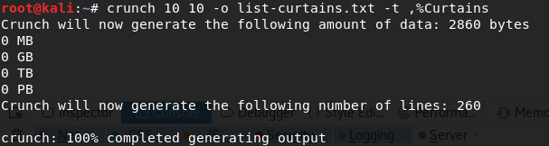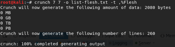 The command I used specifies: the min-max length of the word (7 and 10), the output file (option -o) and a pattern to respect, in this case , for an uppercase letter and % for a digit, followed by the word "Flesh" and "Curtains".