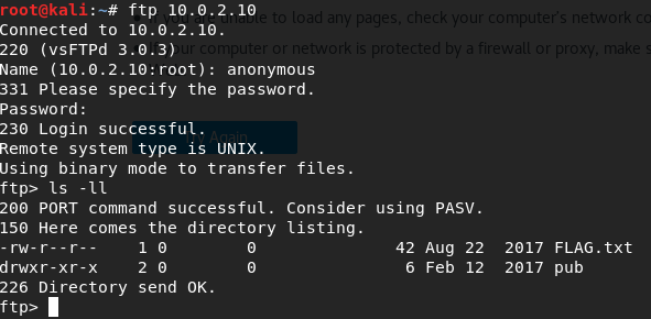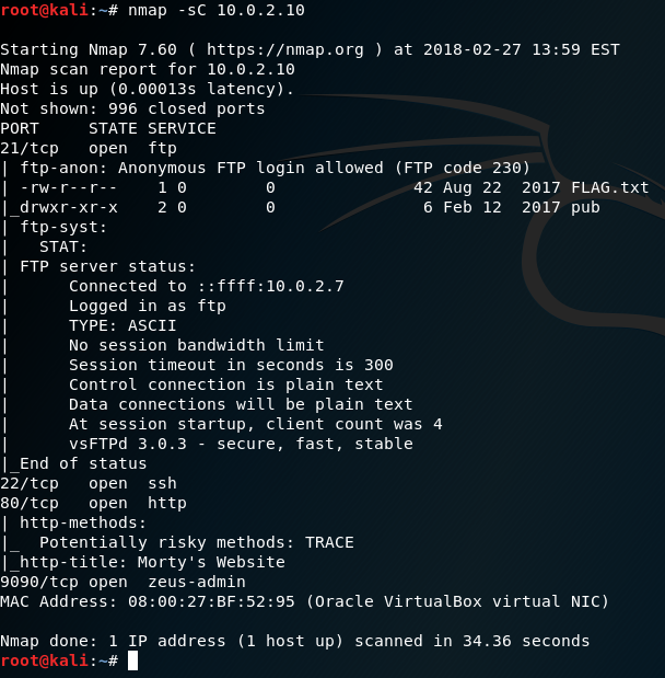 Pretty interesting things here. Above all things, that it allows anonymous FTP login, and even lists the files in the root directory (first FLAG.txt!) because of ftp-anon.