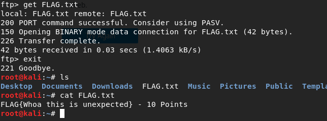 'FLAG{Whoa this is unexpected}'. Great, our 10 first points.