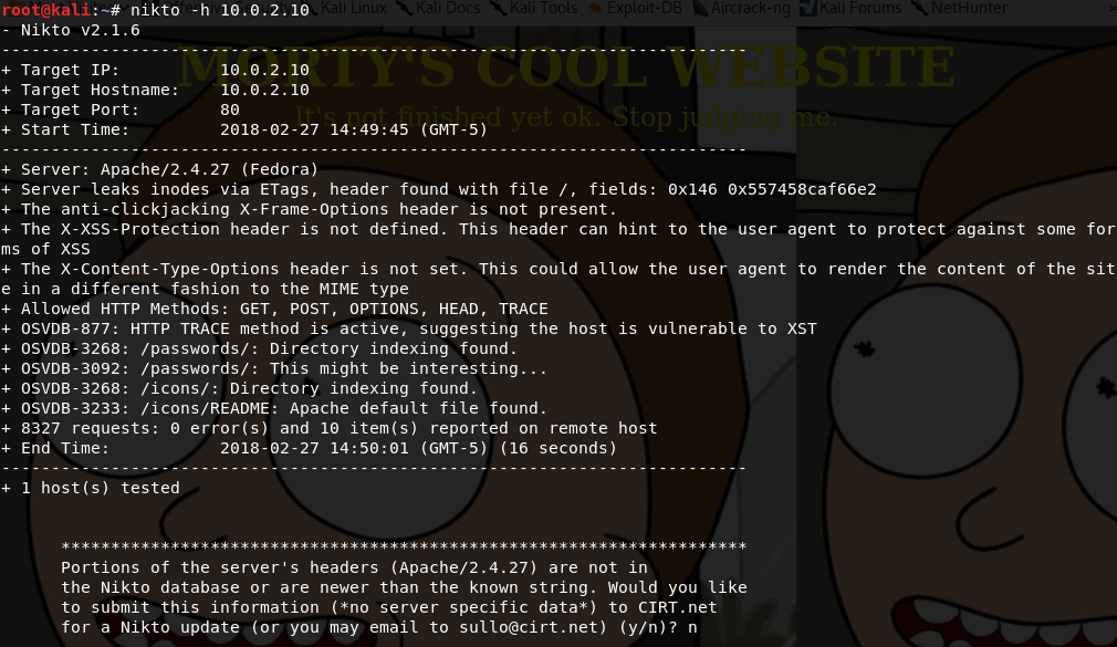 After looking for clues in the ftp port, I decide to move on and run a nikto scan on port 80, to see if there's anything there. Here are my findings: